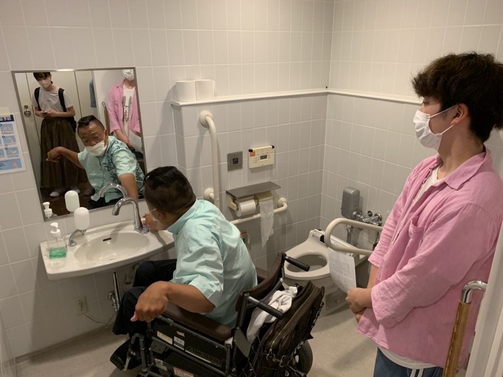例えば、多目的トイレはあるのですが、鏡の位置が高いこと、非常ベルに紐がないこと、ウォシュレットのボタンが小さいこと、蓋上に開けるゴミ箱の不便さなどが指摘されました。また、トイレについては、手すりが上下に動くタイプのトイレだけではなく、横に動くタイプのトイレもあった方がいいなど、多目的トイレによっても当事者の状況によって様々なものが設置されていることが重要であることが指摘されていて、学生は感銘を受けていました。