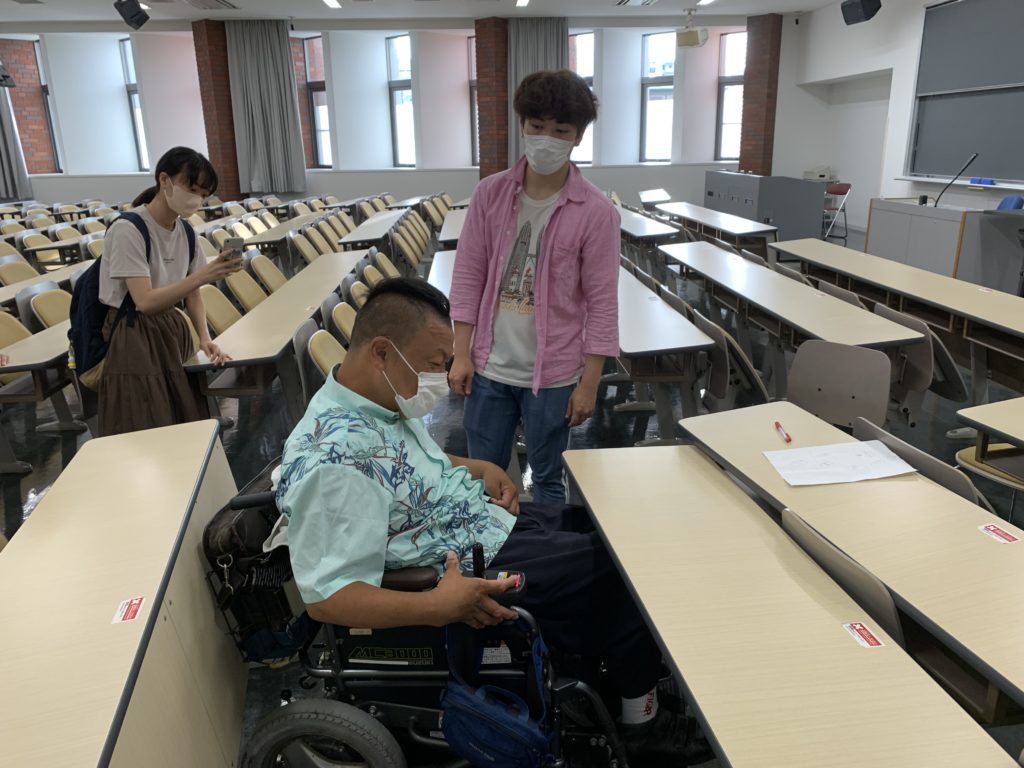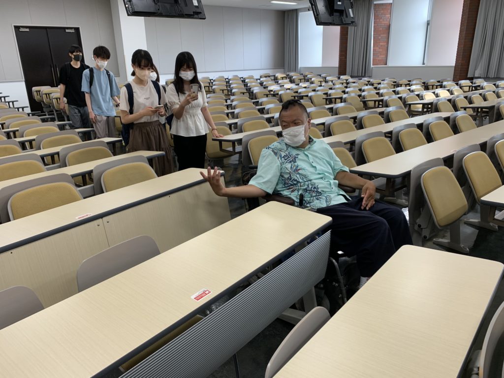 大久保さんは、建物を設計する段階から車椅子ユーザーの当事者が参画すべきだと語っていました。新町キャンパスを設計するときに、車椅子ユーザーを含めて障害当事者はどの程度、参画できていたのでしょうか。私たちは、改めて当事者の目線で考えることの重要性を感じました。学生たちはバリアフリーチェックの結果をもとに報告書を作成しますが、改善点などをSDA室に要望することも検討しているようです。調査は単に調査のためにあるのではなく、状況を改革するためにあることを、学生たちは学んでいるようです。大久保さん、これからもよろしくお願いします。