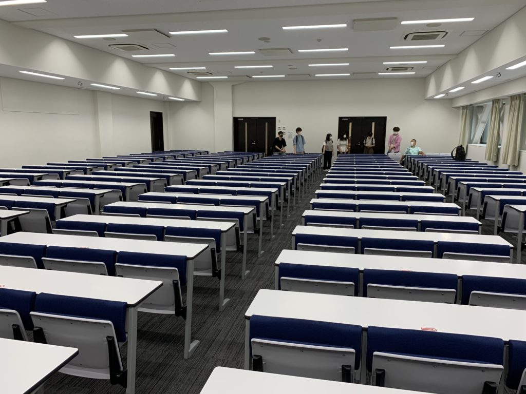 そして、R201の大教室は数多くの課題があることがわかりました。学生の立場で考えると、座れる場所は、一番後ろか、前かの選択肢しかありません。大久保さんは中間にも車椅子で入れるスペースがあるといいと話しています。前には、いちおう、車椅子用のスペースを確保したとみられる移動式の机もあります。しかし、スペースが十分に確保されておらず、車椅子が入るのが困難でした。また壇上にはスロープが設置されていて、車椅子で上がれるようにはなっていますが、スロープの幅が狭く、壇上から降りるのは極めて危険なほどでした。