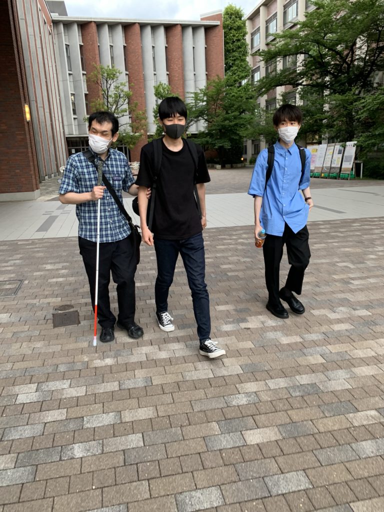 写真:3回生の野々村さんを安達君と本吉君がバス停まで送ってくれました。