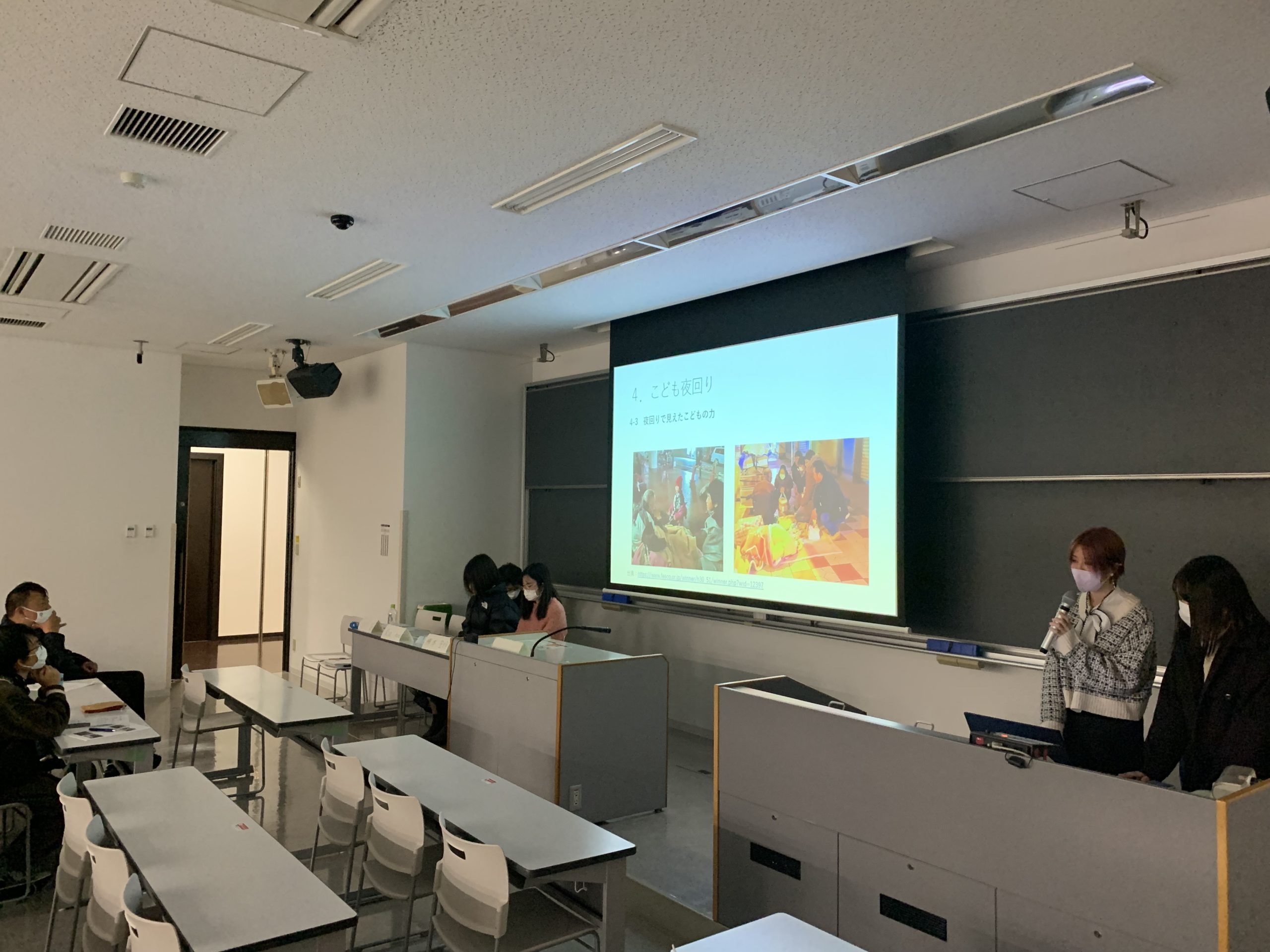 当日は、3回生の佐々木晴哉君がコーディネーターをして、各グループが研究成果の報告をしました。まず、大阪市西成区にある通称「釜ヶ崎」とNPO法人子どもの里でのフィールドワーク及びインタビュー調査の報告がなされました。こどもの里における子どもの権利はどのように捉えられているのかという問題意識のもと、子どもの権利条約、子どもを主体性のある存在として尊重すること、社会資源に依拠して生きることが子どもの権利を保障する上で重要であることが明らかになったことが報告されました。