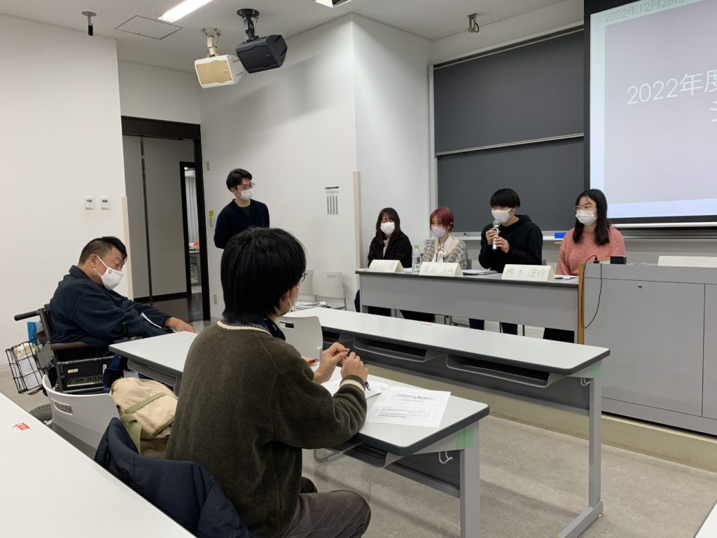 2022年12月26日(月)の16:40~18:10にR204で2022年度鈴木ゼミ3回生による学生主催のシンポジウムが行なわれました。今年度に行っフィールードワークの調査結果を報告し、会場参加者とのあいだで意見交換がなされていました。当日会場には、授業にも来て下さった身体障害当事者でバリアフリー活動家の大久保健一さん、2021年度にゲストスピーカーとしてゼミに参加した吃音当事者の八木智大さんにご参加いただきました。さらに、次年度のゼミについて検討している社会福祉学科の2回生5名にもご参加いただきました。