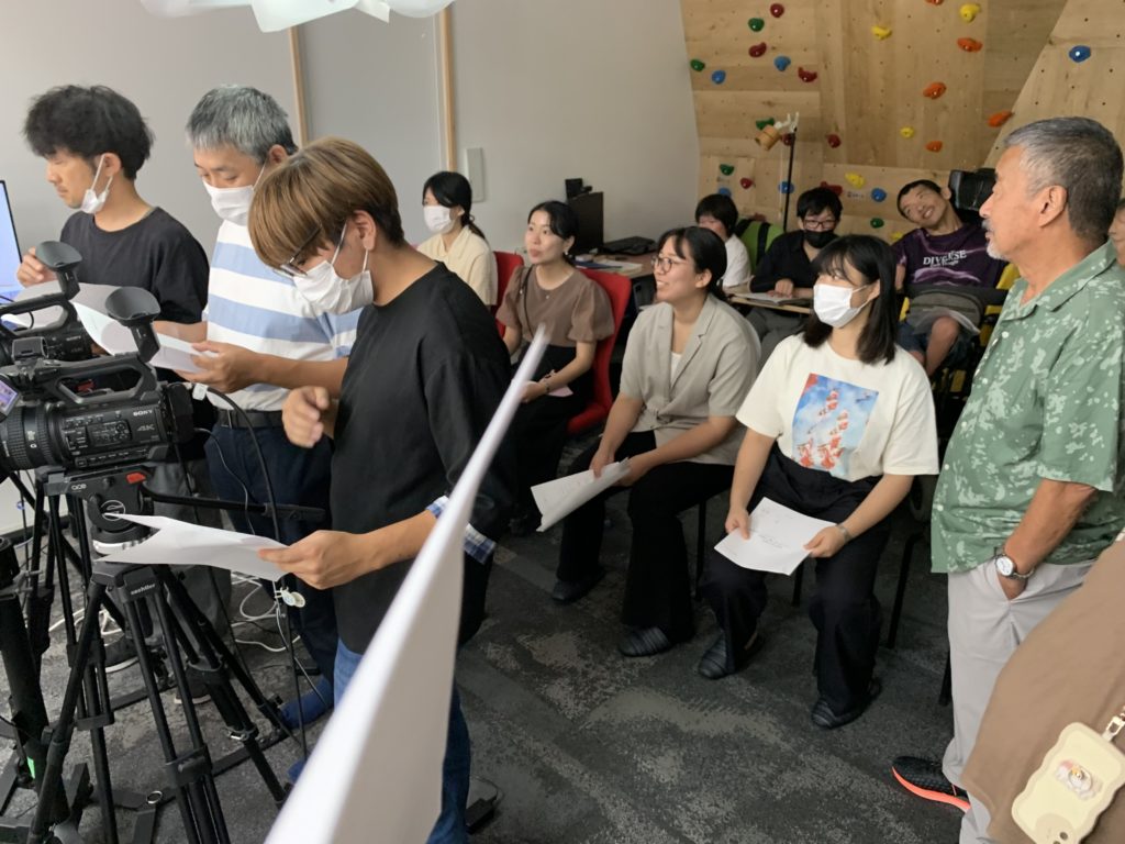 例えば、知的障害のある当事者がキャスターをしたり、スイッチャー(カメラの切り替え)を担当したり、音の敏感な視覚障害のある当事者にはノイズチェックをしてもらったり、アシスタント・ディレクターとして指示を送っている当事者もおりました。当事者に応じた支援も提供されています。第2カメラの操作を担当している知的障害のある当事者に、第1と第2カメラを担当する職員が必要に応じて支援を行なっていました。